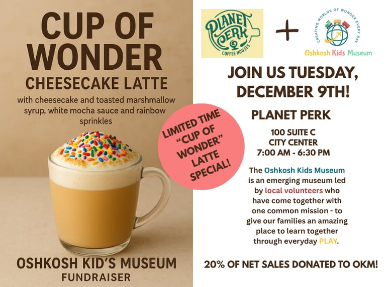 Join us Tuesday, December 9th at Planet Perk where 20% of net sales will be donated back to the Oshkosh Kids Museum!